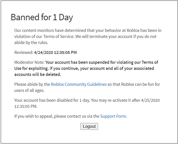 Roblox 7 day ban. Please review our rules and only upload appropriate content. Enjoy the videos and music you love upload original content and share it all with friends family and the world on youtube. 1 day ban 3 day ban 7 day ban 14 day ban account deletion this image is not appropriate for roblox. The player s account is officially banned from using roblox for seven days 1 week or 168 hours.